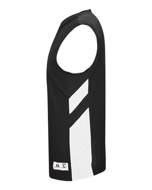 100% polyester with moisture-management/antimicrobial properties Collegiate fit Double-needle hem Self-fabric V-neck collar Reversible Contrast side inserts Individually hemmed bottom for easy access screening Alleson size jock tag This product meets the following Sustainable Style subcategory: Socially Conscious Manufacturing: This product was made in a facility that has partnered with or is accredited by the Fair Labor Association.