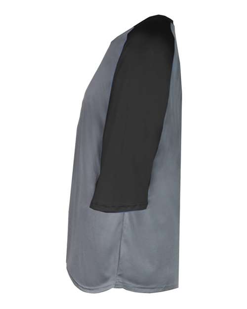 3.5 oz./yd², 100% polyester moisture-management/antimicrobial performance fabric Contrasting 3/4 raglan sleeves Contrast self-fabric collar Double-needle shirt tail hem Badger heat-seal logo on left sleeve This product meets the following Sustainable Style subcategory: Socially Conscious Manufacturing: This product was made in a facility that has partnered with or is accredited by the Fair Labor Association.