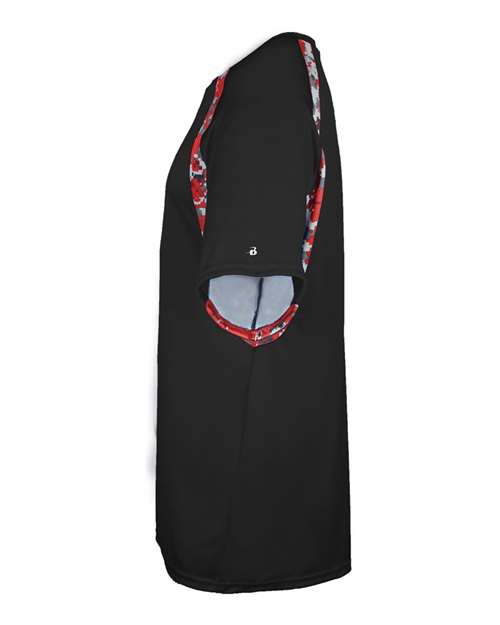 100% polyester moisture-management/antimicrobial performance fabric Self-fabric collar Sublimated digital side and sleeve panels Double-needle stitched hem Badger heat-seal logo on left sleeve This product meets the following Sustainable Style subcategory: Socially Conscious Manufacturing: This product was made in a facility that has partnered with or is accredited by the Fair Labor Association.