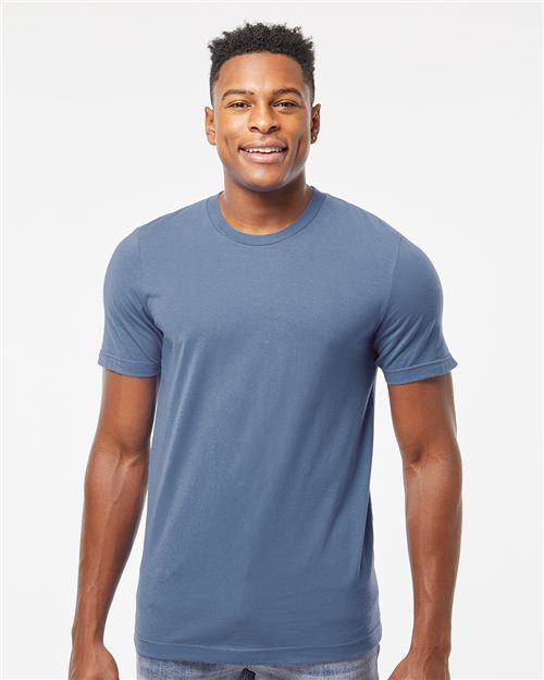 4.3 oz./yd²., 100% combed ringspun USA premium cotton fine jersey, 30 singles Heather Grey is 90/10 combed ringspun USA premium cotton/polyester Reactive-dyed, dischargeable Pre-washed to minimize shrinkage Ribbed collar Taped neck and shoulders Side seams Double-needle sleeves and bottom hem Tear away label USMCA Certified