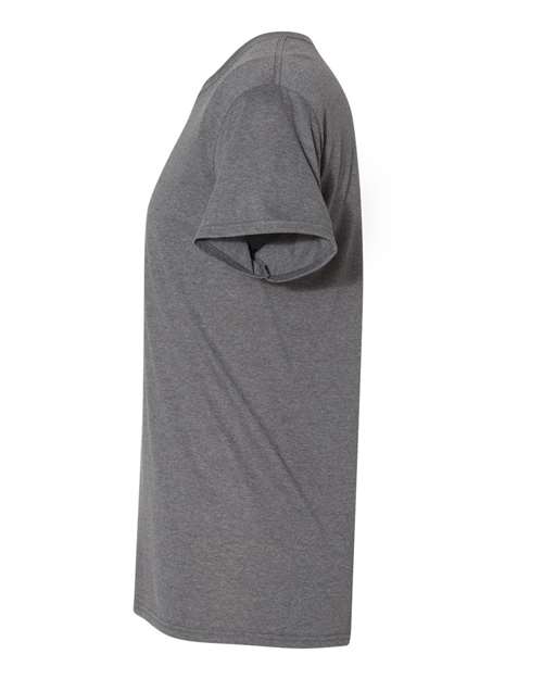 4.5 oz./yd², 50/37/13 polyester/cotton/rayon Pre-shrunk jersey Advanced moisture-management properties Seamless 1x1 ribbed collar Double-needle coverstitching on front neck Double-needle stitching on sleeves and bottom hem Shoulder-to-shoulder taping Quarter-turned to eliminate center crease Tear away label